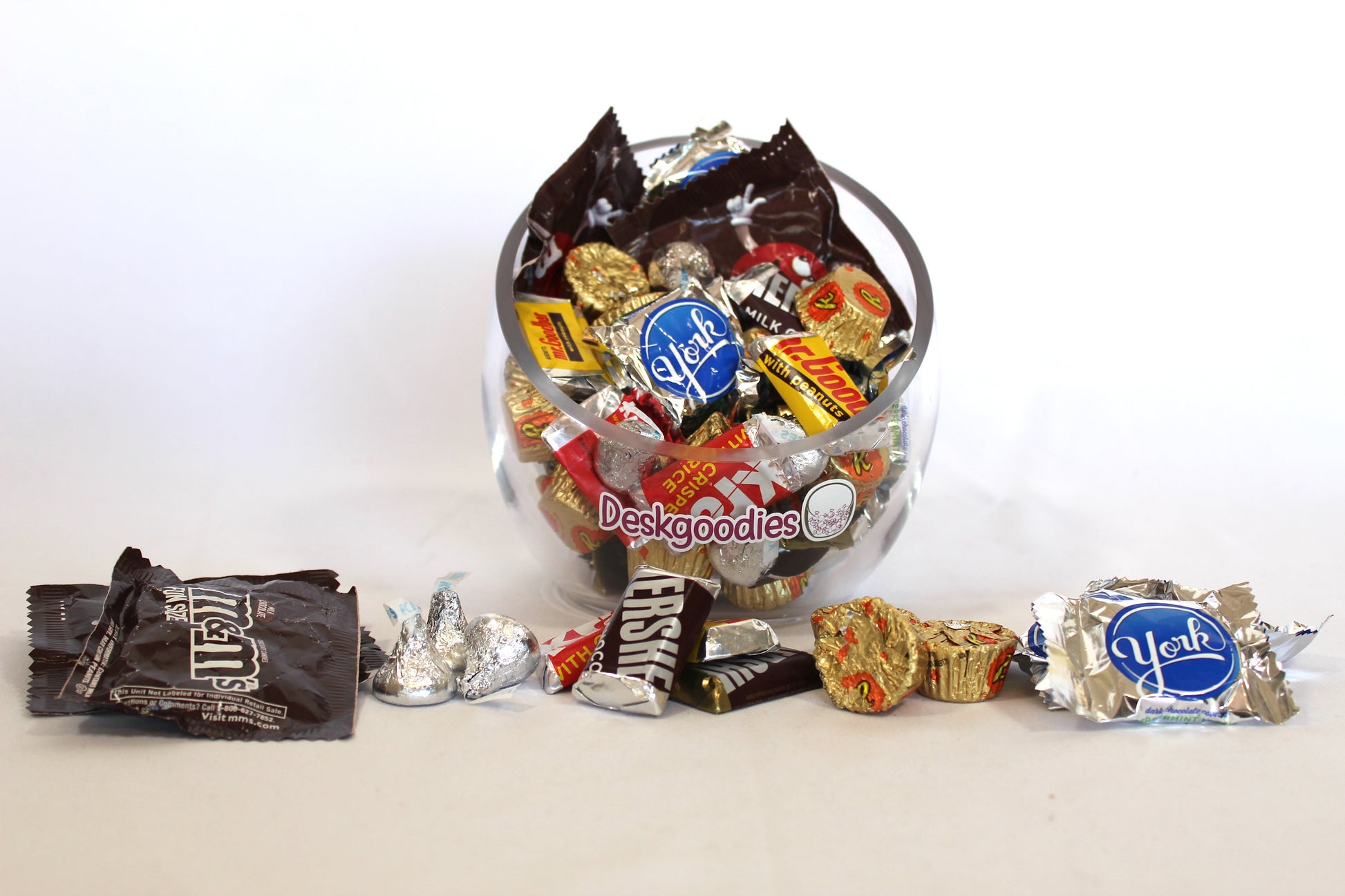 This candy subscription includes: Hershey Kisses, Hershey Mini Assort., Reese's, M&M's, and York.